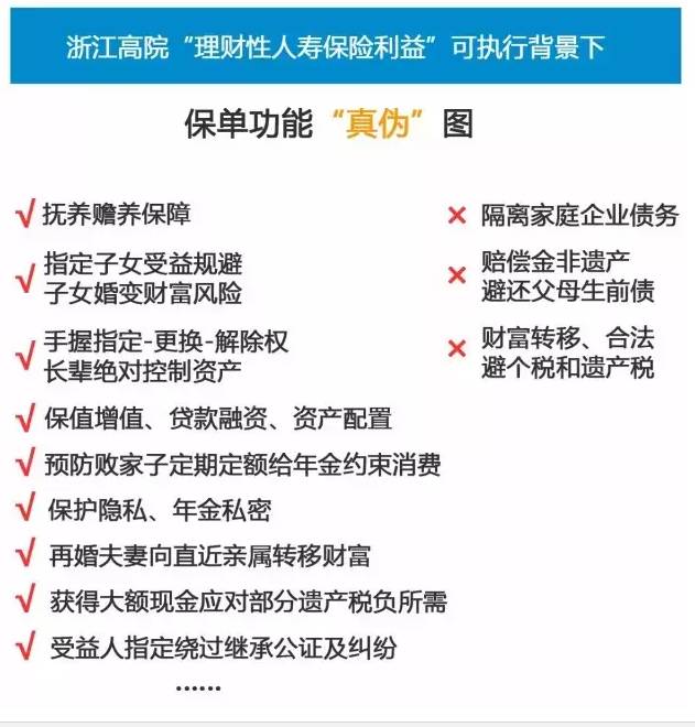 一、投保人购买传统型、分红型、投资连接型、万能型人身保险产品、依保单约定可获得的生存保险金、或以现金方式支付的保单红利、或退保后保单的现金价值,均属于投保人、被保险人或受益人的财产权。当投保人、被保险人或受益人作为被执行人时,该财产权属于责任财产,人民法院可以执行。